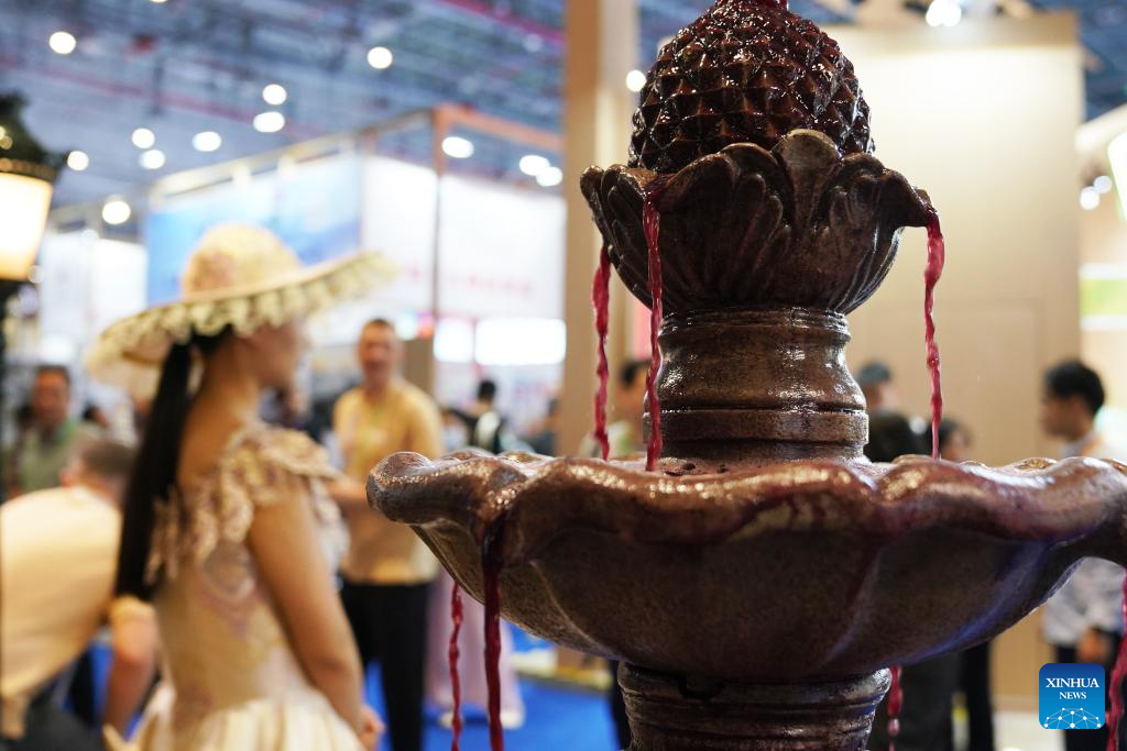 This photo taken on Nov. 8, 2023 shows a red wine fountain at the 6th China International Import Expo (CIIE) in east China's Shanghai. (Xinhua/Li Mengjiao)