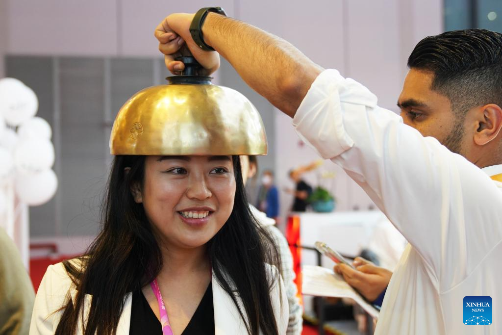 A visitor experiences singing bowl, a kind of tool for sound therapy, at the 6th China International Import Expo (CIIE) in east China's Shanghai, Nov. 9, 2023. (Xinhua/Li Mengjiao)
