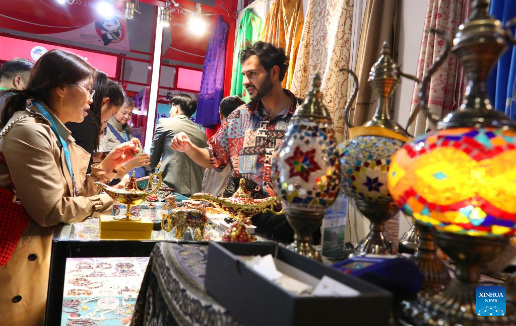 An exhibitor (R) from Yemen introduces handicrafts to visitors at the 6th China International Import Expo (CIIE) in east China's Shanghai, Nov. 10, 2023. (Xinhua/Fang Zhe)