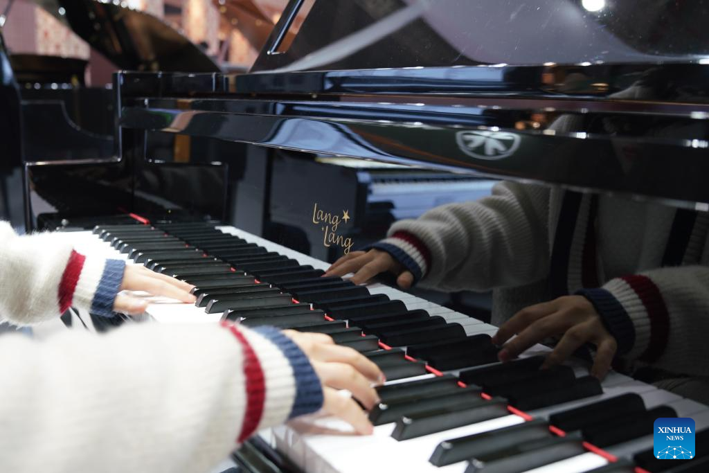 A visitor plays the piano at the booth of Steinway&Sons at the 6th China International Import Expo (CIIE) in east China's Shanghai, Nov. 9, 2023. (Xinhua/Li Mengjiao)