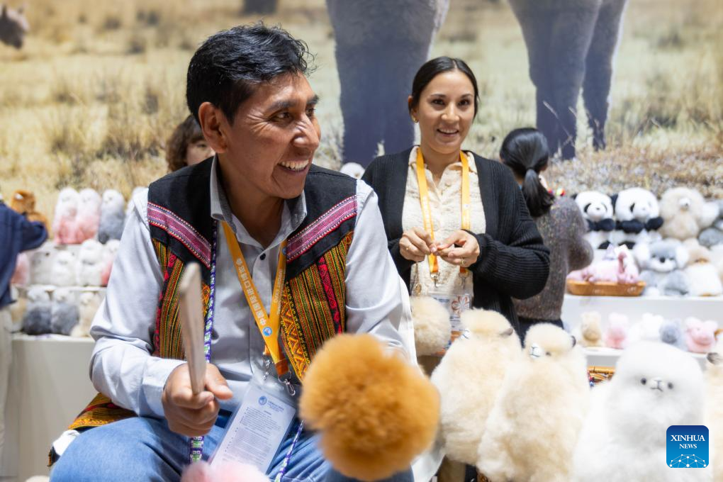 Peruvian craftsman Oswaldo Mamani promotes alpaca toys at a booth of Warmpaca at the 6th China International Import Expo (CIIE) in east China's Shanghai, Nov. 7, 2023. (Xinhua/Wang Xiang)