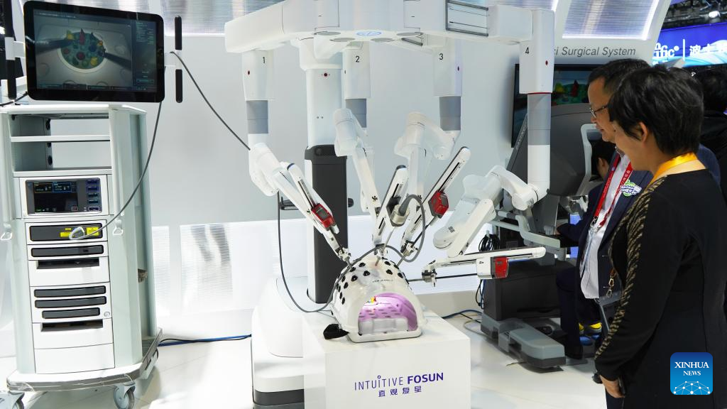 Visitors look at a surgical robot at the booth of IntuitiveFosun at the 6th China International Import Expo (CIIE) in east China's Shanghai, Nov. 7, 2023. (Xinhua/Jin Haoyuan)