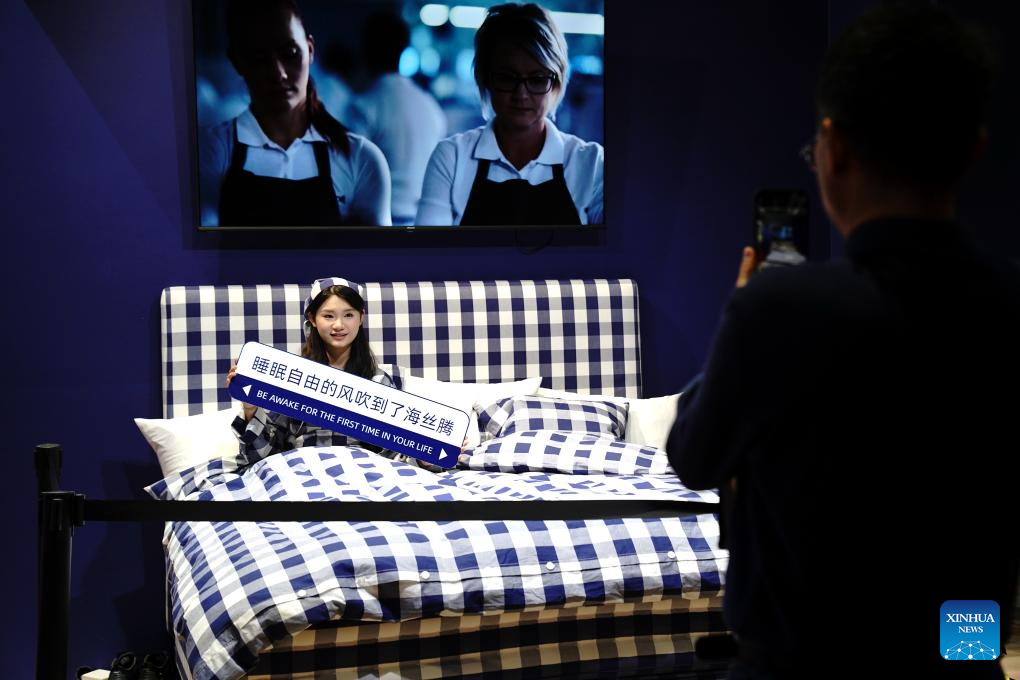 A model shows bedding products from Sweden company Hastens at the 6th China International Import Expo (CIIE) in east China's Shanghai, Nov. 8, 2023. (Xinhua/Zhang Jiansong)