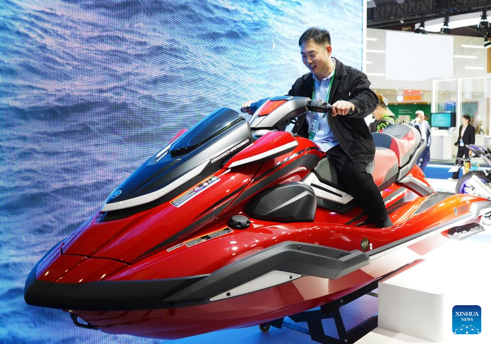 A visitor tries a FX Cruiser SVHO of Yamaha at the 6th China International Import Expo (CIIE) in east China's Shanghai, Nov. 10, 2023. (Xinhua/Jin Haoyuan)