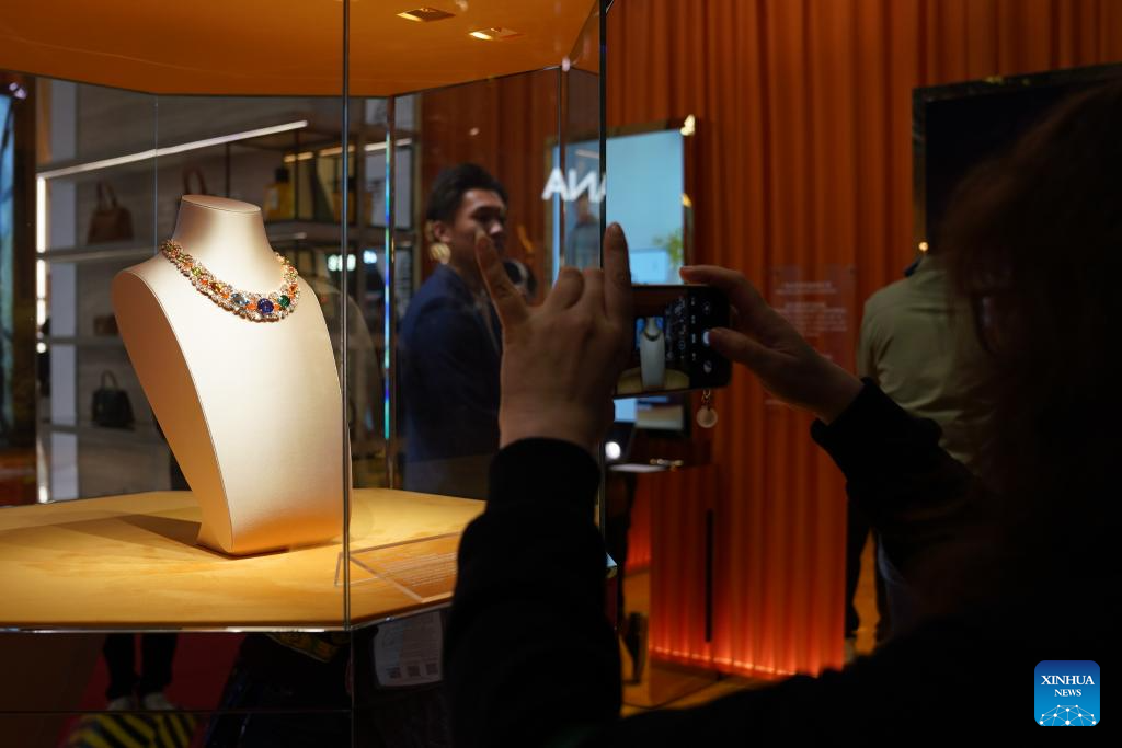 Visitors take photos of jewelry displayed at the booth of Bulgari at the 6th China International Import Expo (CIIE) in east China's Shanghai, Nov. 9, 2023. (Xinhua/Li Mengjiao)