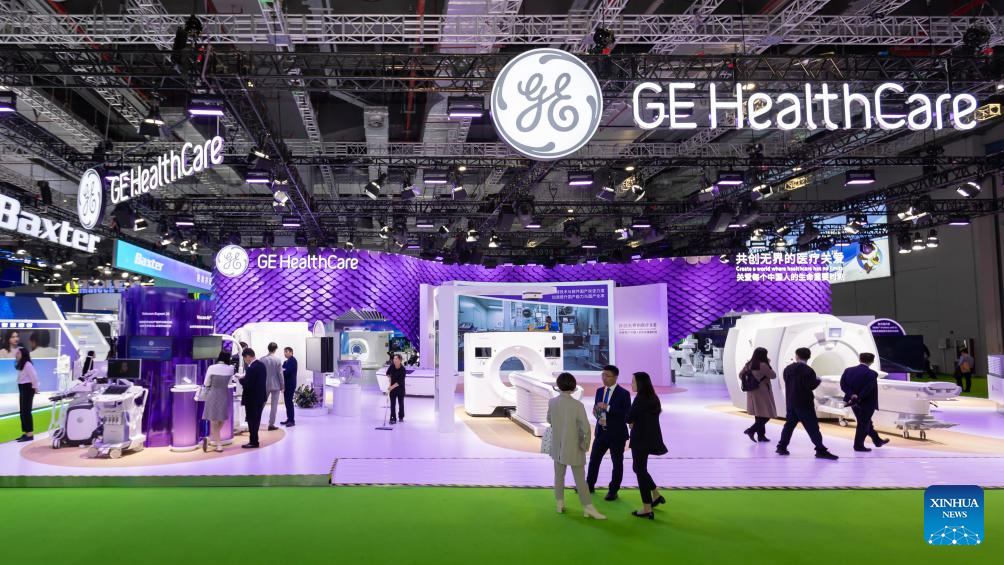 This photo taken on Nov. 8, 2023 shows a booth of GE HealthCare at the 6th China International Import Expo (CIIE) in east China's Shanghai. (Xinhua/Wang Xiang)
