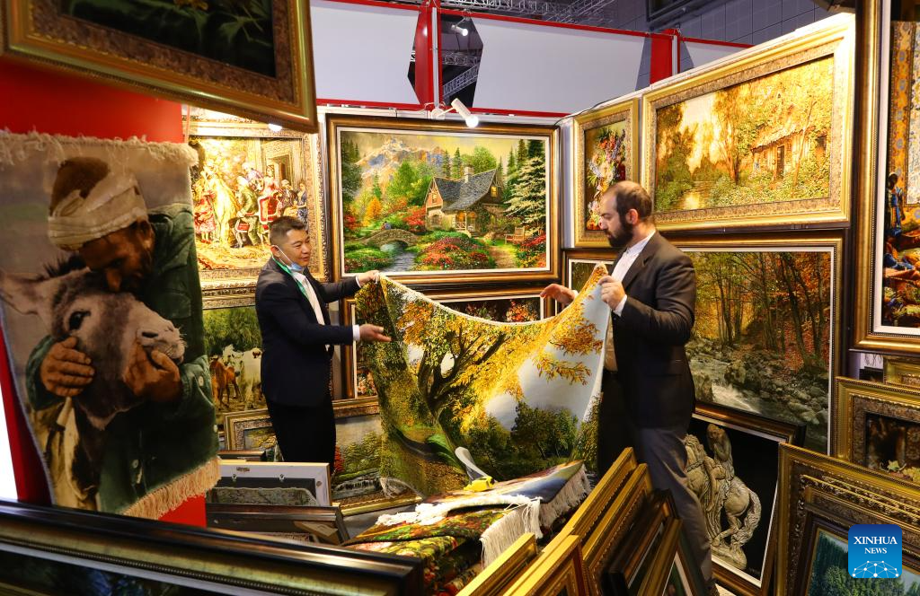 A visitor (L) checks a landscape carpet at a booth of Iranian handmade carpets at the 6th China International Import Expo (CIIE) in east China's Shanghai, Nov. 10, 2023. (Xinhua/Fang Zhe)