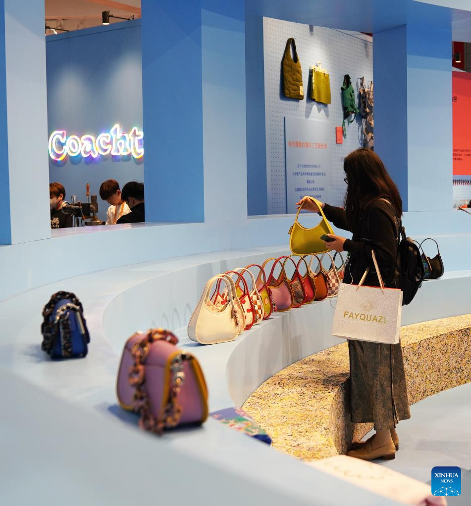 A visitor looks at handbags at the booth of Coach at the 6th China International Import Expo (CIIE) in east China's Shanghai, Nov. 9, 2023. (Xinhua/Li Mengjiao)