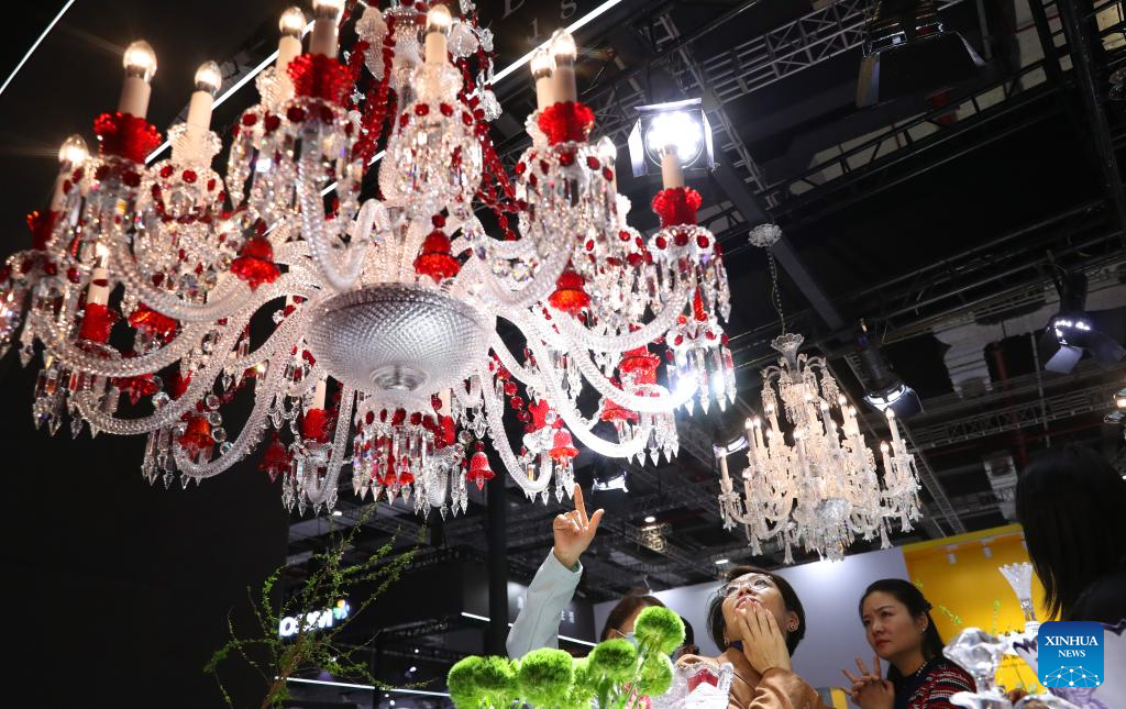 Visitors look at a crystal ceiling lamp from the Czech Republic at the 6th China International Import Expo (CIIE) in east China's Shanghai, Nov. 10, 2023. (Xinhua/Fang Zhe)