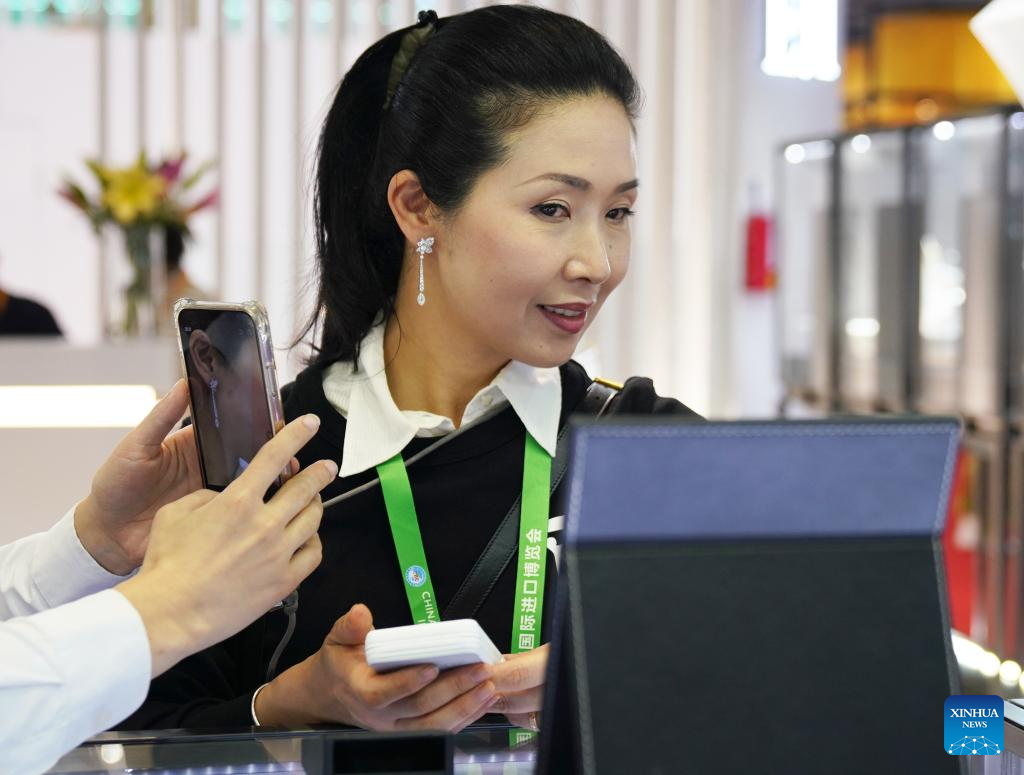 A visitor tries on diamond earrings at the booth of Jewelry company EJI during the 6th China International Import Expo (CIIE) in east China's Shanghai, Nov. 9, 2023. (Xinhua/Li Mengjiao)