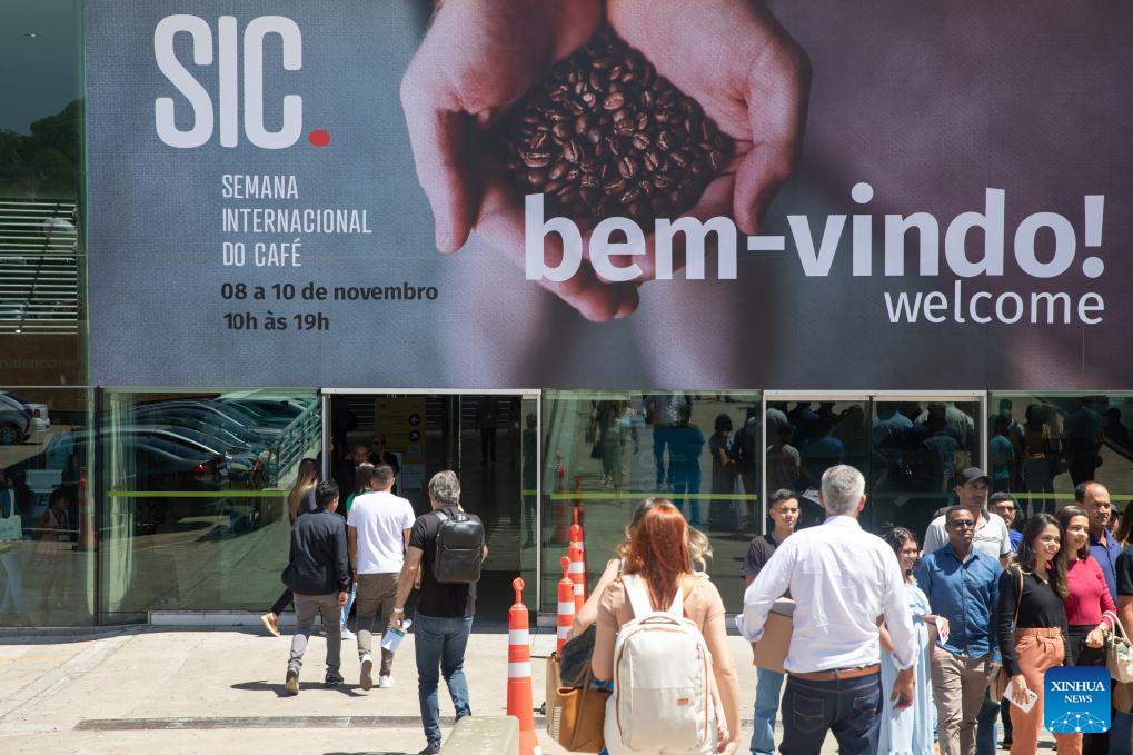 Visitors are pictured outside the venue of the SIC (international coffee week) 2023 in Belo Horizonte, Brazil, Nov. 9, 2023. The three-day event, featuring activities such as lectures, courses and competitions, attracts more than 20 thousand participants from over 40 countries and regions. (Xinhua/Wang Tiancong)