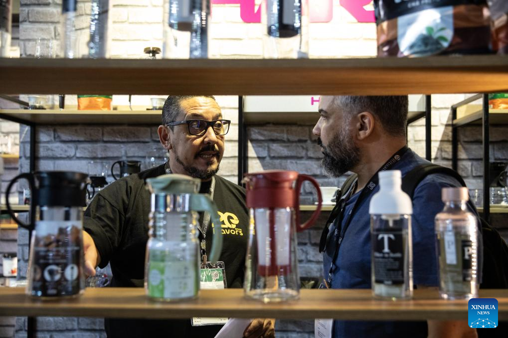 A staff member introduces coffee-making gadgets to a visitor at the SIC (international coffee week) 2023 in Belo Horizonte, Brazil, Nov. 9, 2023. The three-day event, featuring activities such as lectures, courses and competitions, attracts more than 20 thousand participants from over 40 countries and regions. (Xinhua/Wang Tiancong)
