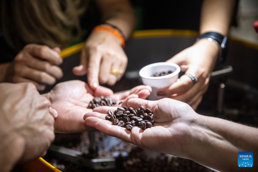 Visitors observe roasted coffee beans at the SIC (international coffee week) 2023 in Belo Horizonte, Brazil, Nov. 9, 2023. The three-day event, featuring activities such as lectures, courses and competitions, attracts more than 20 thousand participants from over 40 countries and regions. (Xinhua/Wang Tiancong)