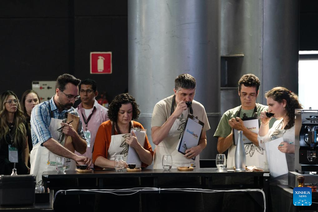 Judges taste coffee during a competition at the SIC (international coffee week) 2023 in Belo Horizonte, Brazil, Nov. 9, 2023. The three-day event, featuring activities such as lectures, courses and competitions, attracts more than 20 thousand participants from over 40 countries and regions. (Xinhua/Wang Tiancong)