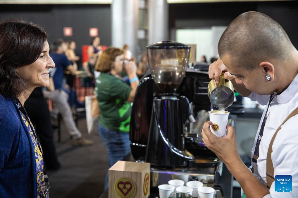 A barista makes coffee for visitors at the SIC (international coffee week) 2023 in Belo Horizonte, Brazil, Nov. 9, 2023. The three-day event, featuring activities such as lectures, courses and competitions, attracts more than 20 thousand participants from over 40 countries and regions. (Xinhua/Wang Tiancong)