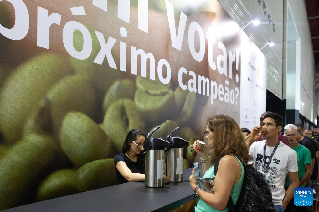 Visitors taste coffee at the SIC (international coffee week) 2023 in Belo Horizonte, Brazil, Nov. 9, 2023. The three-day event, featuring activities such as lectures, courses and competitions, attracts more than 20 thousand participants from over 40 countries and regions. (Xinhua/Wang Tiancong)