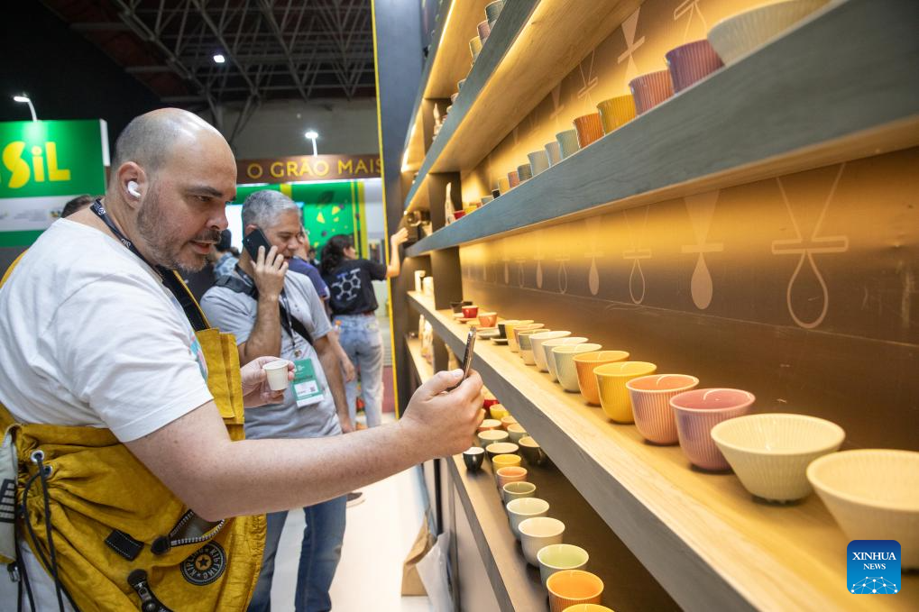 A visitor takes pictures of coffee cups at the SIC (international coffee week) 2023 in Belo Horizonte, Brazil, Nov. 9, 2023. The three-day event, featuring activities such as lectures, courses and competitions, attracts more than 20 thousand participants from over 40 countries and regions. (Xinhua/Wang Tiancong)
