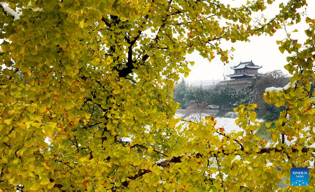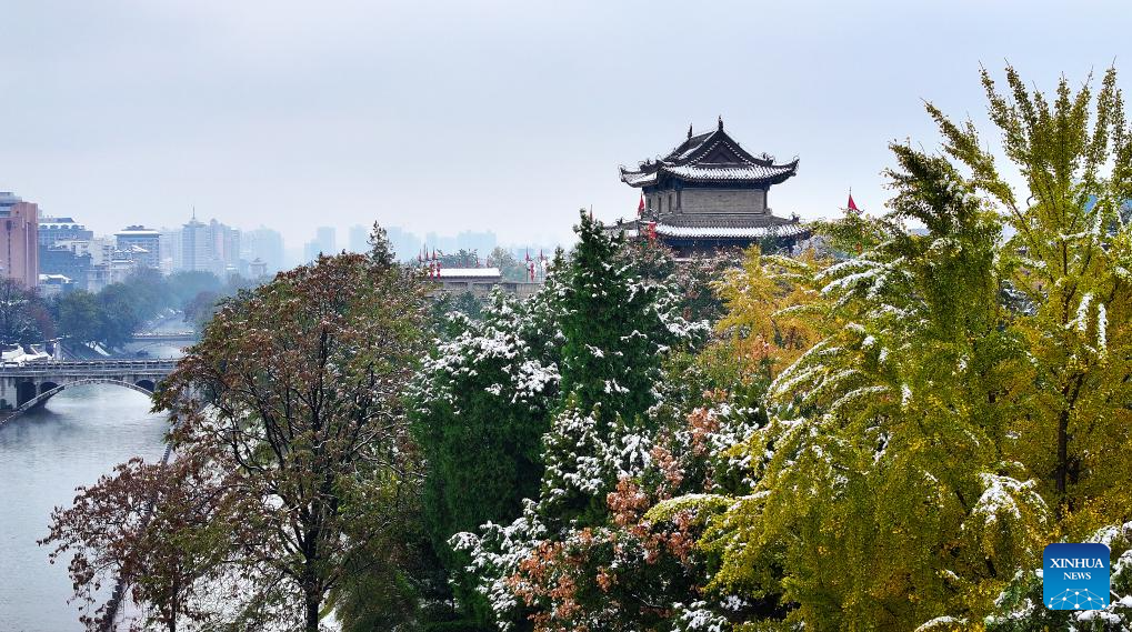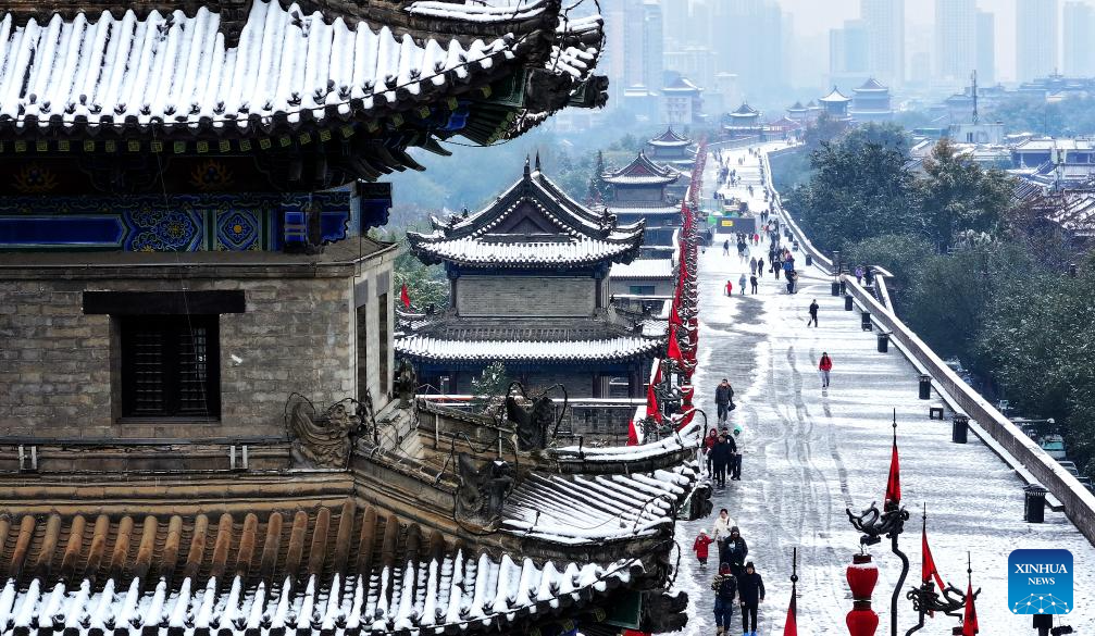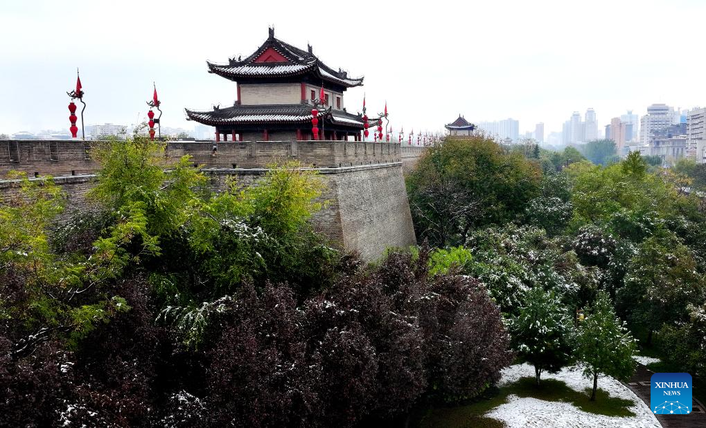 This aerial photo taken on Nov. 11, 2023 the view of snow-covered ancient city wall in Xi'an, northwest China's Shaanxi Province. Xi'an witnessed a snowfall on Saturday, the first one after traditional solar term of Lidong, which means the beginning of winter and fell on Nov. 8 this year. (Xinhua/Liu Xiao)