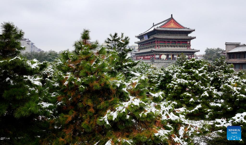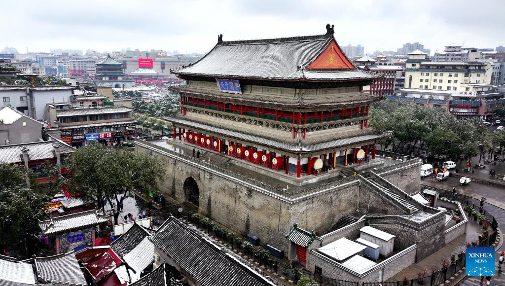 This aerial photo taken on Nov. 11, 2023 the view of snow-covered Drum Tower in Xi'an, northwest China's Shaanxi Province. Xi'an witnessed a snowfall on Saturday, the first one after traditional solar term of Lidong, which means the beginning of winter and fell on Nov. 8 this year. (Xinhua/Liu Xiao)