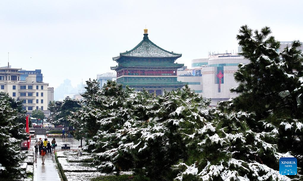 This aerial photo taken on Nov. 11, 2023 the view of snow-covered Bell Tower in Xi'an, northwest China's Shaanxi Province. Xi'an witnessed a snowfall on Saturday, the first one after traditional solar term of Lidong, which means the beginning of winter and fell on Nov. 8 this year. (Xinhua/Liu Xiao)