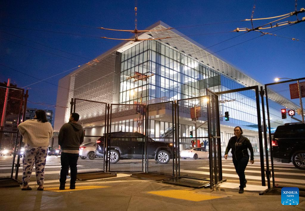 Metal fences are set outside the venue of the 30th APEC Economic Leaders' Meeting in San Francisco, California, the United States, Nov. 10, 2023. The meeting is going to be held in San Francisco. (Photo by Li Jianguo/Xinhua)