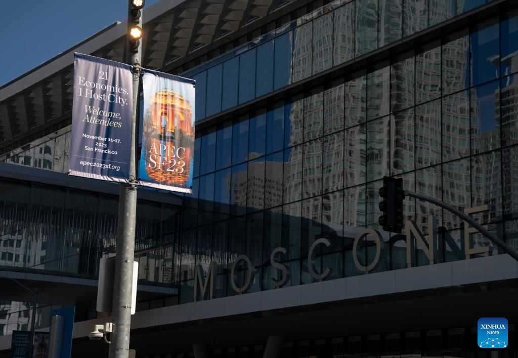 This photo taken on Nov. 7, 2023 shows banners depicting the upcoming 30th APEC Economic Leaders' Meeting outside the venue of the meeting in San Francisco, California, the United States. The 30th APEC Economic Leaders' Meeting is going to be held in San Francisco. (Photo by Li Jianguo/Xinhua)