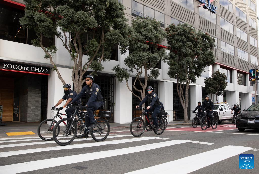 Police patrol outside the venue of the 30th APEC Economic Leaders' Meeting in San Francisco, California, the United States, Nov. 10, 2023. The meeting is going to be held in San Francisco. (Photo by Li Jianguo/Xinhua)