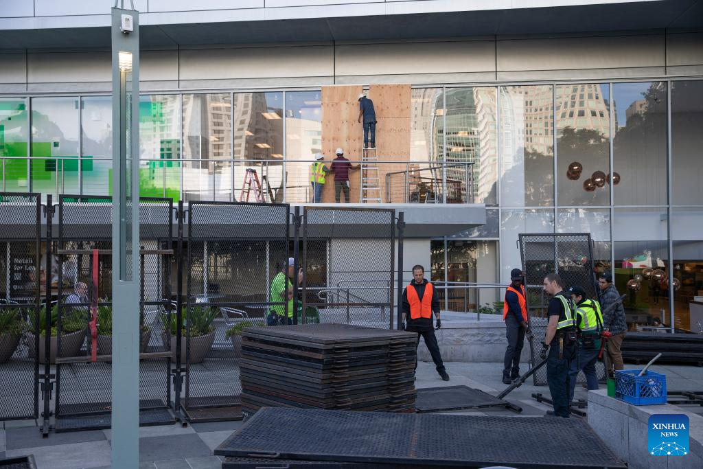 Workers set metal fences outside the venue of the 30th APEC Economic Leaders' Meeting in San Francisco, California, the United States, Nov. 10, 2023. The meeting is going to be held in San Francisco. (Photo by Li Jianguo/Xinhua)