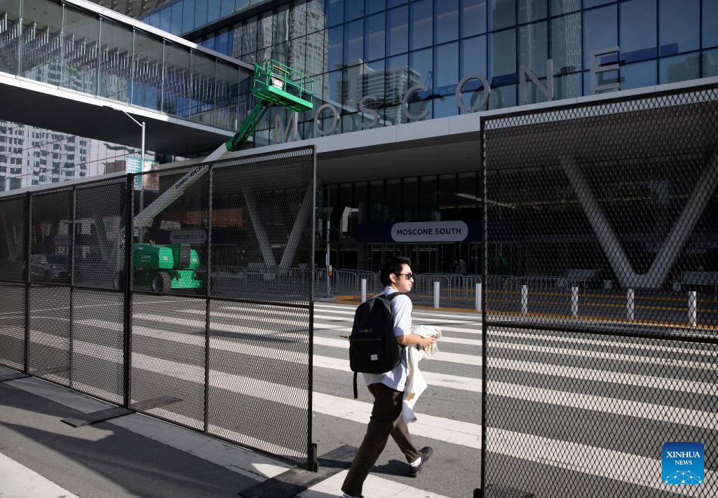 A man passes by metal fences outside the venue of the 30th APEC Economic Leaders' Meeting in San Francisco, California, the United States, Nov. 10, 2023. The meeting is going to be held in San Francisco. (Photo by Li Jianguo/Xinhua)