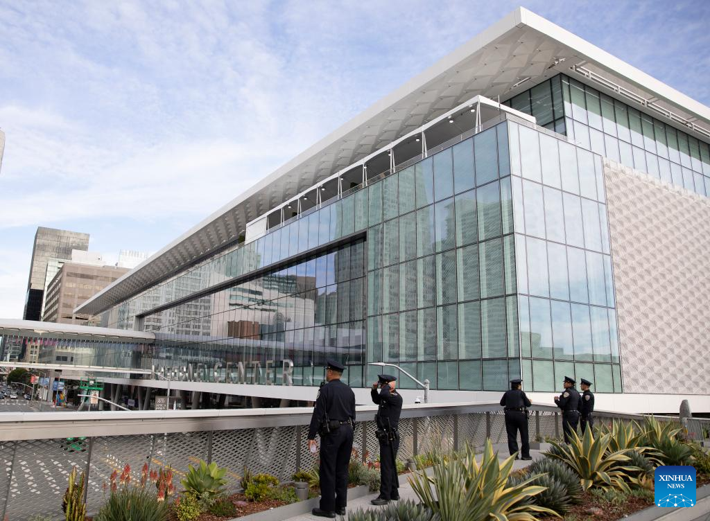 Police are on duty outside the venue of the 30th APEC Economic Leaders' Meeting in San Francisco, California, the United States, Nov. 10, 2023. The meeting is going to be held in San Francisco. (Photo by Li Jianguo/Xinhua)