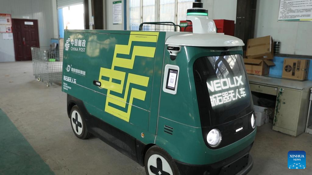 This photo taken on Nov. 2, 2023 shows a Neolix driverless delivery vehicle at a delivery station in Yangquan, north China's Shanxi Province. (Xinhua/Xie Yuan)