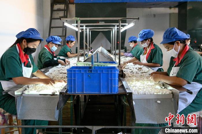Workers are busy selecting silkworm cocoons at a raw silk manufacturing company in Longchuan county, Dehong Dai and Jingpo Autonomous Prefecture, southwest China's Yunnan Province, on Oct. 18, 2023. (Chinanews.com/Li Jiaxian)