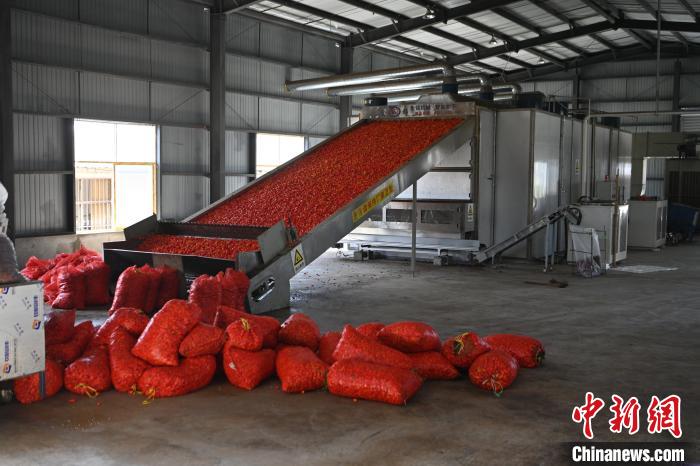 A machine dries chili peppers at a factory in Manghai town, Dehong Dai and Jingpo Autonomous Prefecture, southwest China's Yunnan Province, on Oct. 17, 2023. (Chinanews.com/Li Jiaxian)