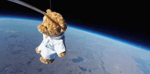 On a clear day with blue skies, the toy bear slowly ascended for 1.5 hours until it reached an altitude of 28,000 meters, capturing a beautiful photo alongside the azure Earth.