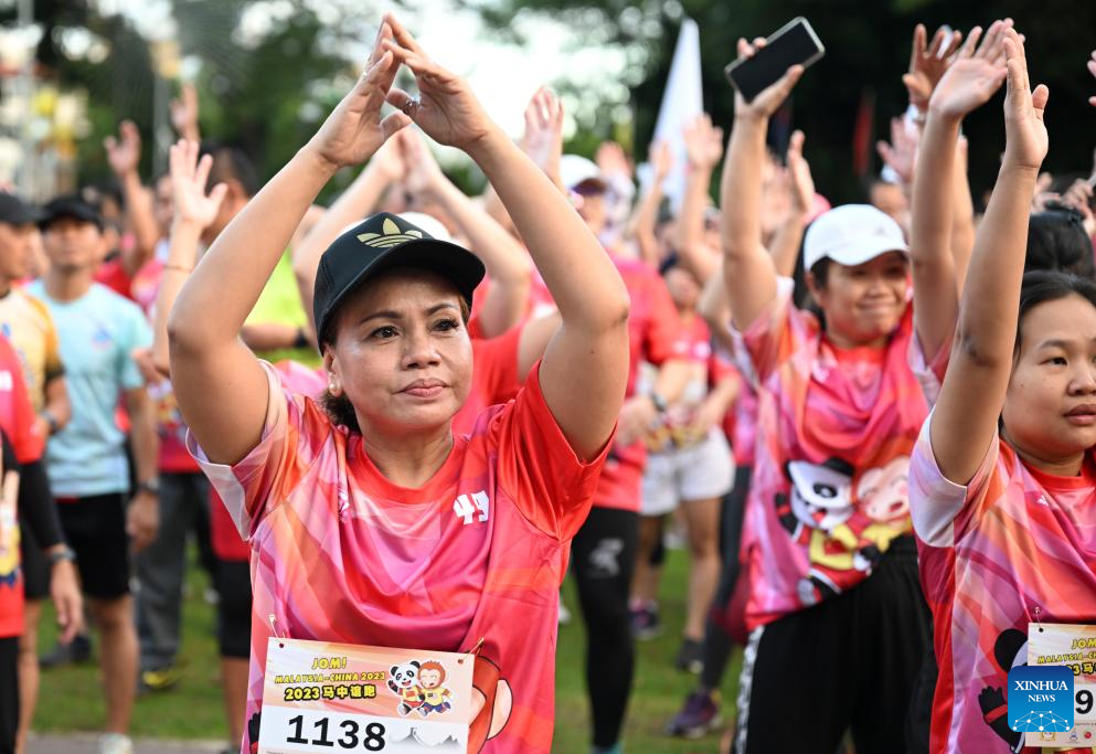 People warm up before the Malaysia-China 2023 friendship run in Kota Kinabalu, Sabah, Malaysia, Nov. 12, 2023. About 3,000 people participated in the event. (Xinhua/Cheng Yiheng)