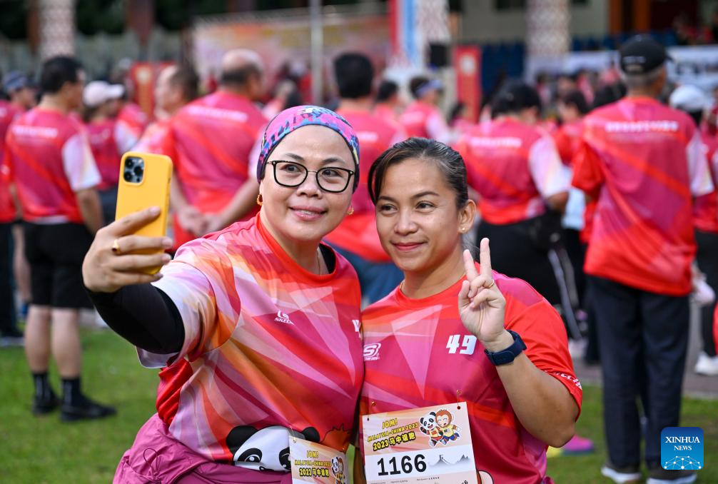 People take selfies during the Malaysia-China 2023 friendship run in Kota Kinabalu, Sabah, Malaysia, Nov. 12, 2023. About 3,000 people participated in the event. (Xinhua/Cheng Yiheng)