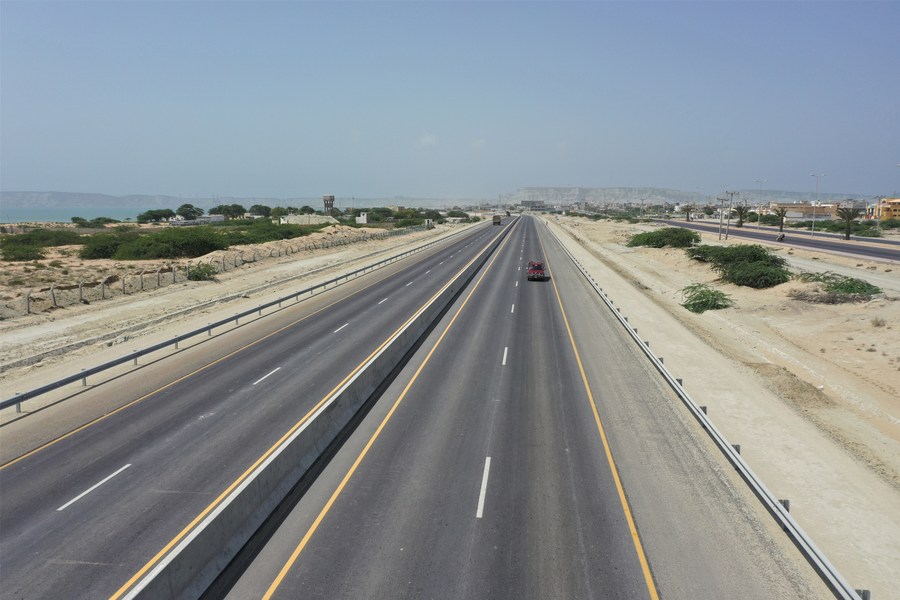 Aerial photo taken on June 3, 2022 shows a section of the China-aided Eastbay Expressway of Gwadar port in Gwadar of Pakistan's southwest Balochistan province. (Xinhua/Jiang Chao)