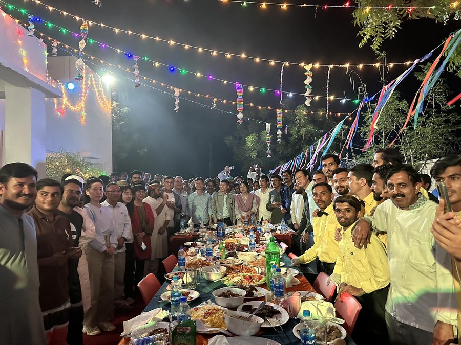 This photo taken on April 22, 2023 shows Chinese and Pakistani staff members of the Thar Coal Block-II Coal Electricity Integration project posing for a group photo during a dinner celebrating Eid al-Fitr in the Thar Desert in Pakistan's south Sindh province. (Str/Xinhua)