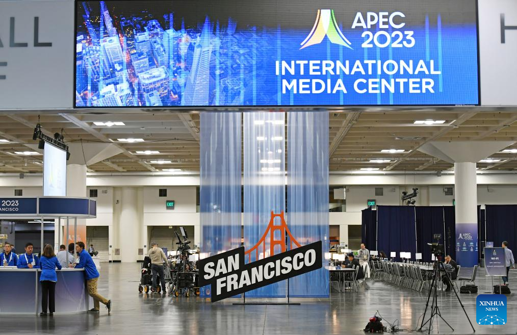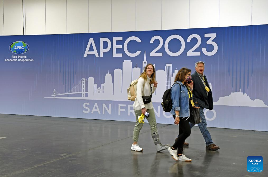 Journalists walk past a poster at the international media center of APEC 2023 in San Francisco, the United States, on Nov. 12, 2023. This year's Asia-Pacific Economic Cooperation (APEC) Economic Leaders' Meeting will be held in San Francisco in the United States from Nov. 15 to 17. (Xinhua/Li Rui)