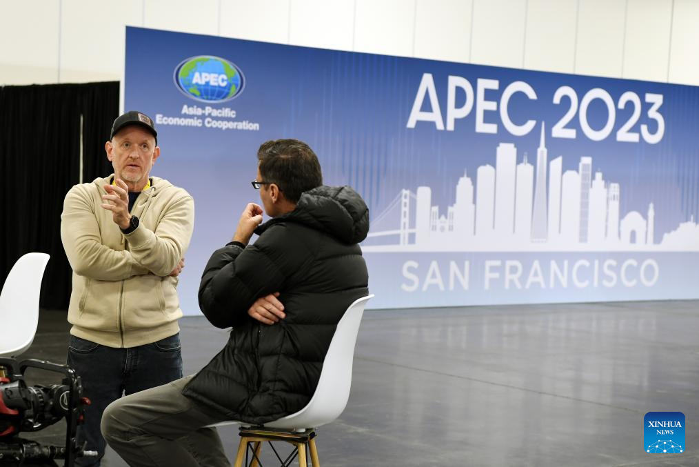 Journalists talk in front of a poster at the international media center of APEC 2023 in San Francisco, the United States, on Nov. 12, 2023. This year's Asia-Pacific Economic Cooperation (APEC) Economic Leaders' Meeting will be held in San Francisco in the United States from Nov. 15 to 17. (Xinhua/Li Rui)