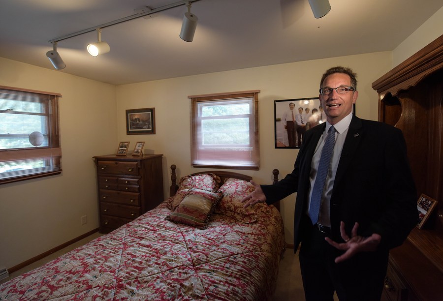 Gary Dvorchak, son of Eleanor and Thomas Dvorchak, the family that hosted Xi Jinping during his 1985 visit to Muscatine, presents the Sino-U.S. Friendship House to visitors, in Muscatine, Iowa, the United States, Sept. 17, 2015. (Xinhua/Bao Dandan)