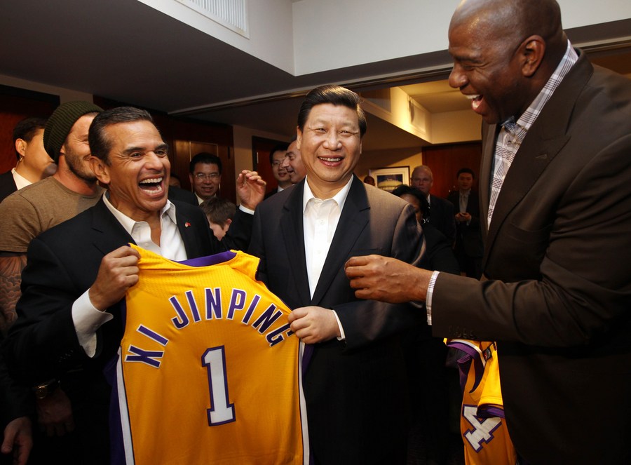 Xi Jinping (C, front) is presented with a souvenir Los Angeles Lakers jersey with his name imprinted on it by former Lakers star Magic Johnson (R, front) at the Staples Center in Los Angeles, the United States, Feb. 17, 2012. (Xinhua/Lan Hongguang)