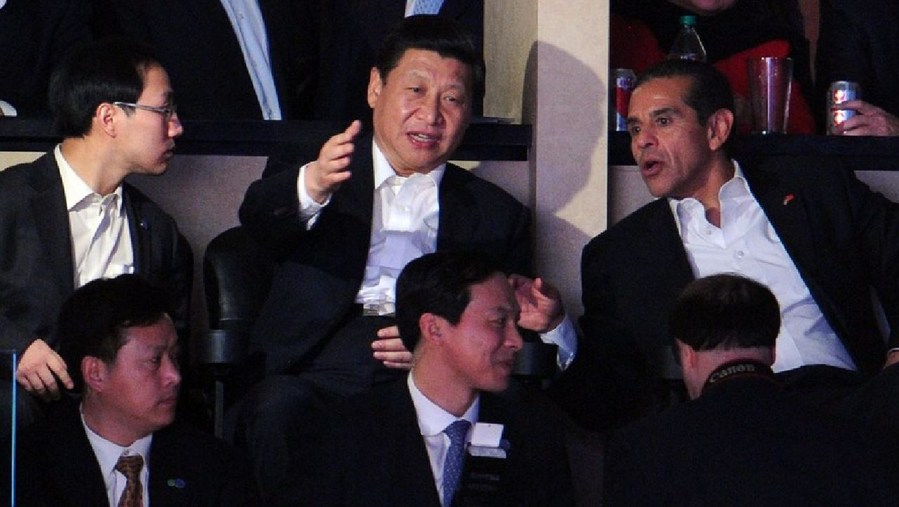 Then Los Angeles Mayor Antonio Villaraigosa sat beside Xi. The two discussed the highlights of the game with each other, laughing from time to time.