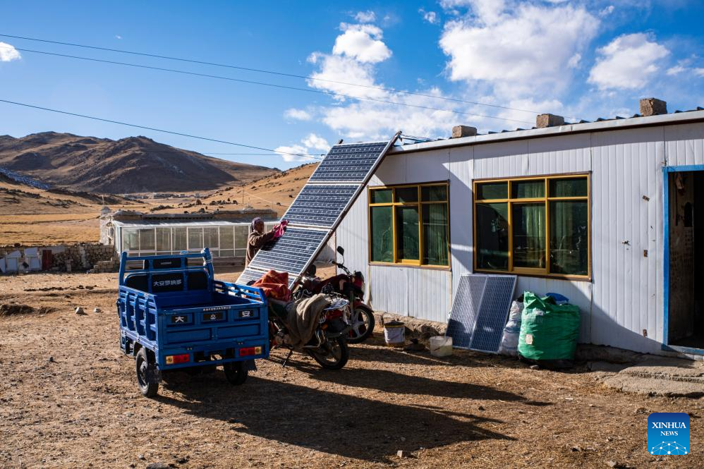 Yonten dusts the solar panels at a winter pasture in Dabug Village of Damxung County, southwest China's Xizang Autonomous Region, Nov. 10, 2023.(Xinhua/Sun Fei)