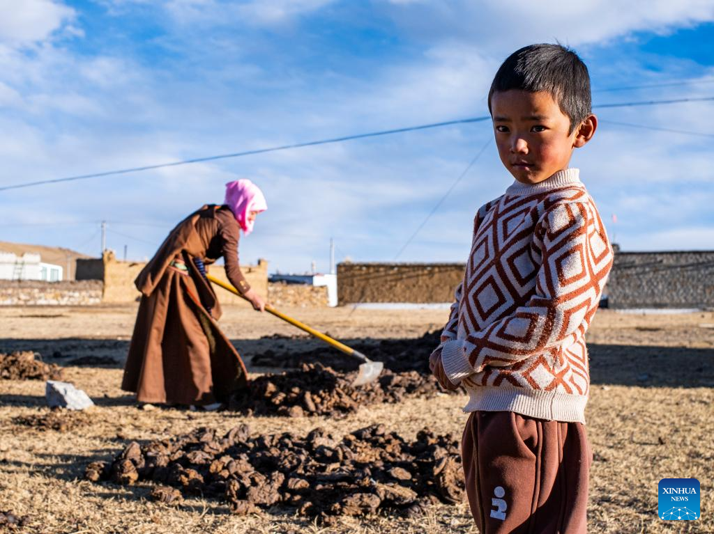A boy helps his mother make cow dung cakes to be used as heating fuel at a winter pasture in Dabug Village of Damxung County, southwest China's Xizang Autonomous Region, Nov. 10, 2023. (Xinhua/Sun Fei)