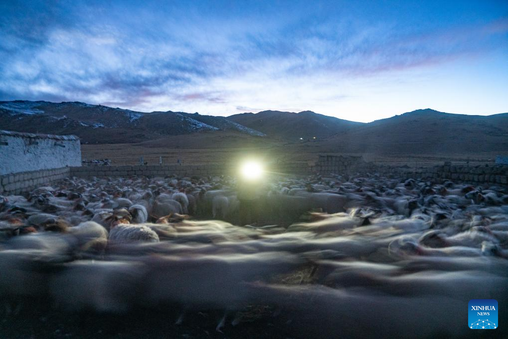 Yonten's father checks the number of his sheep at a winter pasture in Dabug Village of Damxung County, southwest China's Xizang Autonomous Region, Nov. 10, 2023. (Photo by Tenzin Nyida/Xinhua)