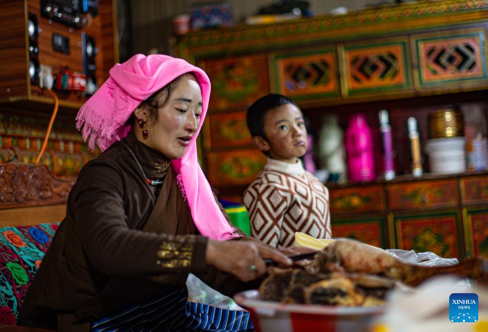 A herdswoman slices beef for her son at a winter pasture in Dabug Village of Damxung County, southwest China's Xizang Autonomous Region, Nov. 10, 2023.(Xinhua/Jigme Dorje)