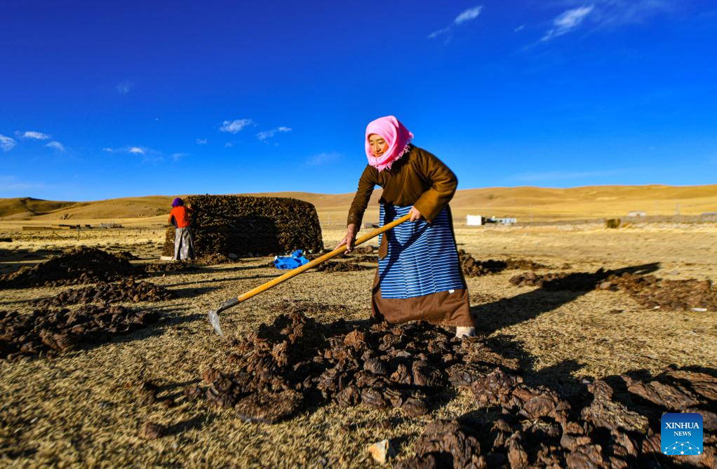 A herdswoman makes cow dung cakes to be used as heating fuel at a winter pasture in Dabug Village of Damxung County, southwest China's Xizang Autonomous Region, Nov. 10, 2023.(Xinhua/Jigme Dorje)
