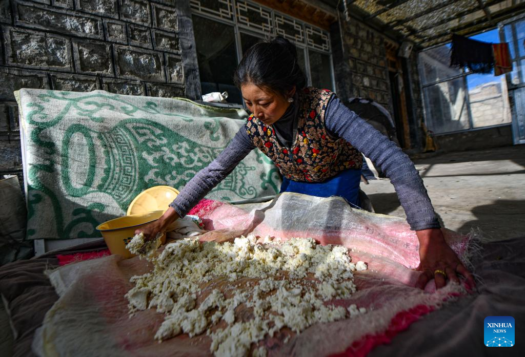 A herdswoman makes dairy food at a winter pasture in Dabug Village of Damxung County, southwest China's Xizang Autonomous Region, Nov. 10, 2023.(Xinhua/Jigme Dorje)
