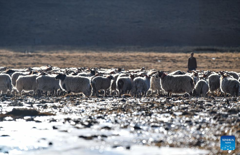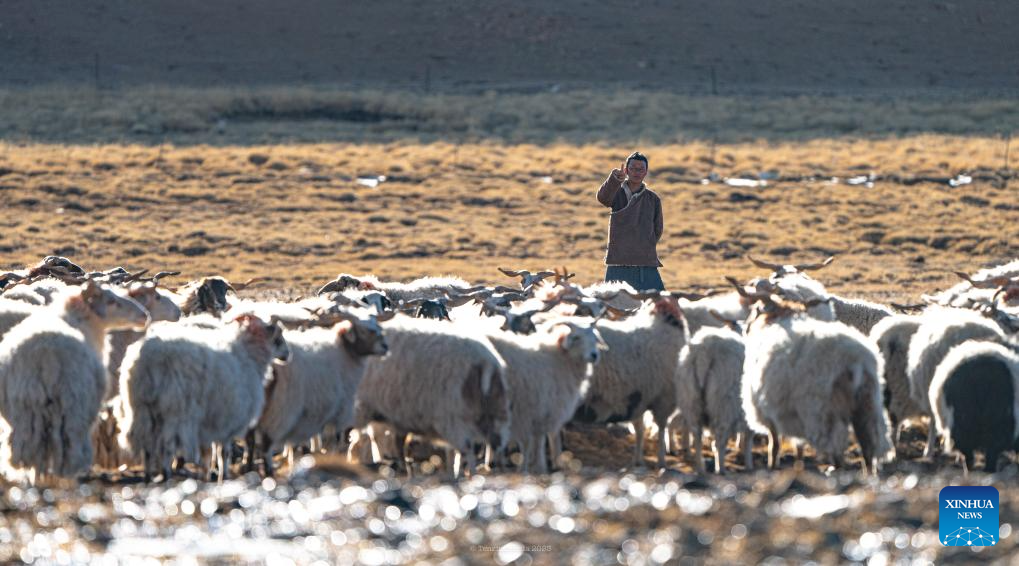 Yonten keeps watch over his sheep at a winter pasture in Dabug Village of Damxung County, southwest China's Xizang Autonomous Region, Nov. 10, 2023. (Xinhua/Jigme Dorje)